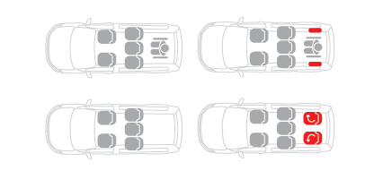 Optional können bis zu zwei zusätzliche Drehklappsitze in der 3. Sitzreihe des Mercedes-Benz eVito / EQV eingebaut werden. Im eingeklappten Zustand der Sitze können, wie in der Basisausstattung, fünf Passagiere und eine Person mit Rollstuhl das Fahrzeug nutzen. Bei ausgeklappten Sitzen können sechs Personen und der Fahrer befördert werden, dann allerdings ohne eine Person im Rollstuhl.