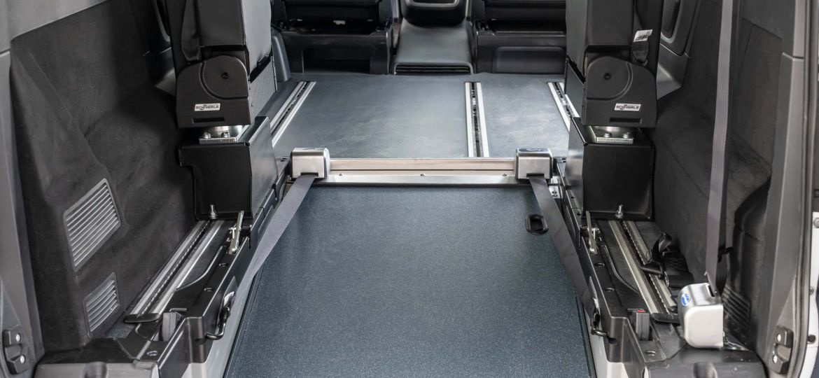 Der umgebaute Mercedes-Benz eVito / EQV mit kurzem und langem Radstand ist ideal für Familien mit grösserem Platzbedarf und Transportunternehmen oder Heime, die sowohl Personen mit und ohne Rollstuhl transportieren. In der Basisausstattung bleibt die original 3er Sitzbank erhalten, wodurch das Fahrzeug mit fünf Passagieren und einer Person im Rollstuhl genutzt werden kann.